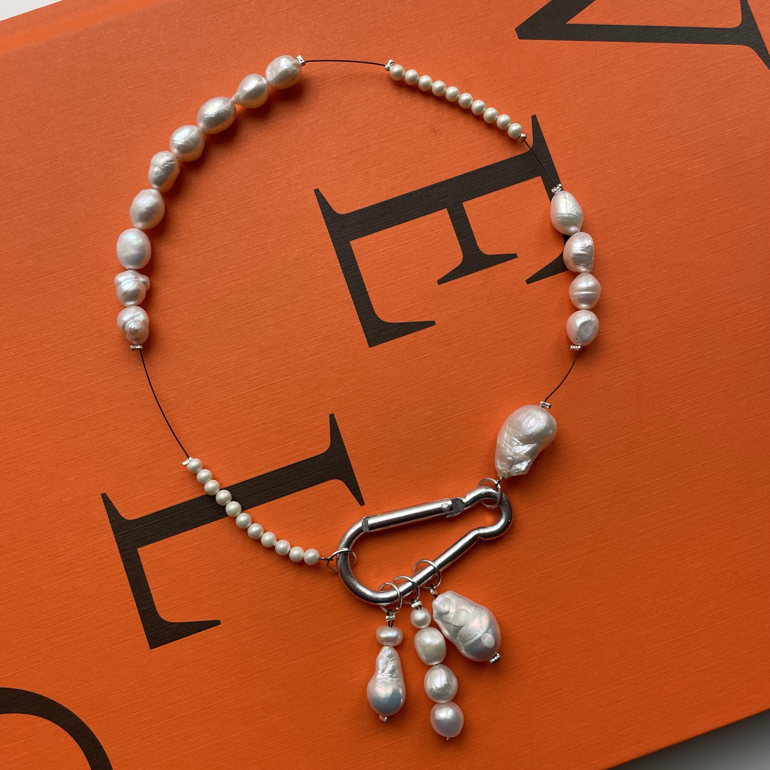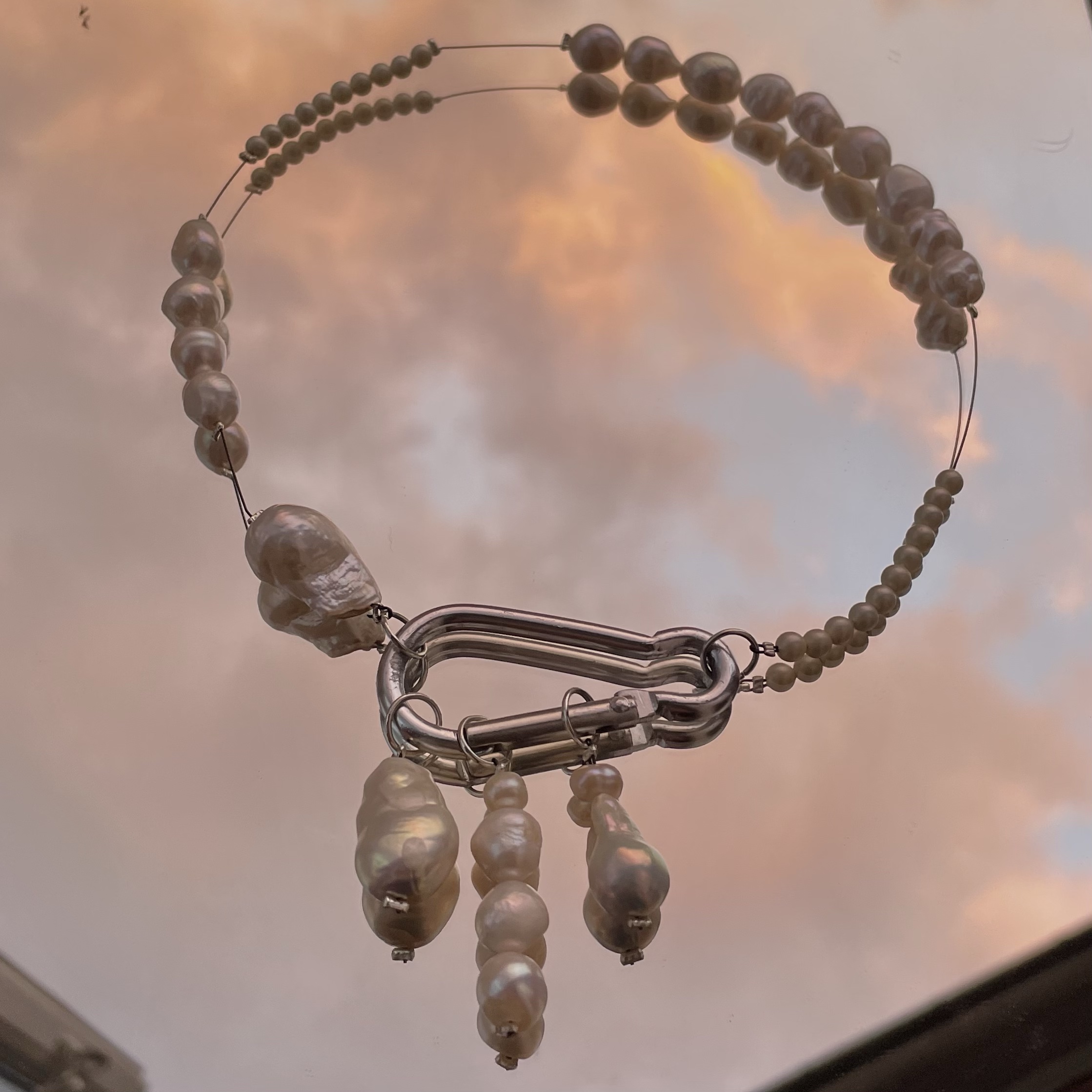 Materialer: ferskvandsperler, keshi baroque ferskvandsperler, ringe i zink, sort tigerwire og clasp i zink.