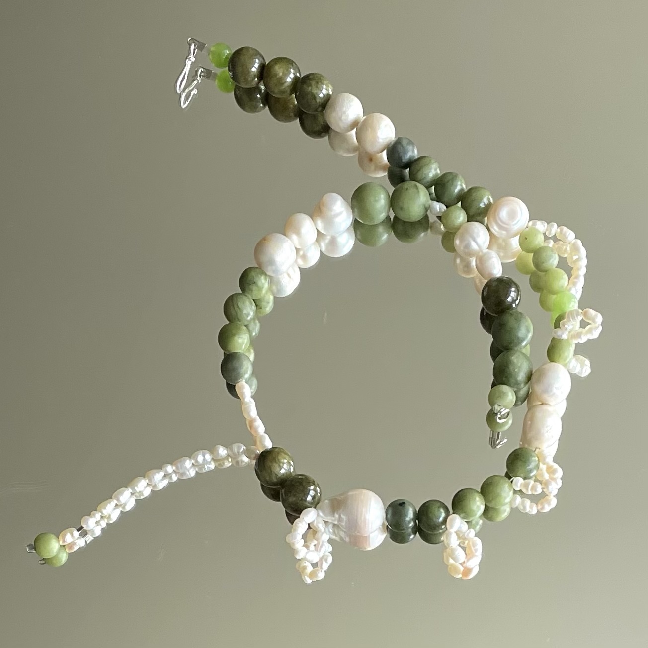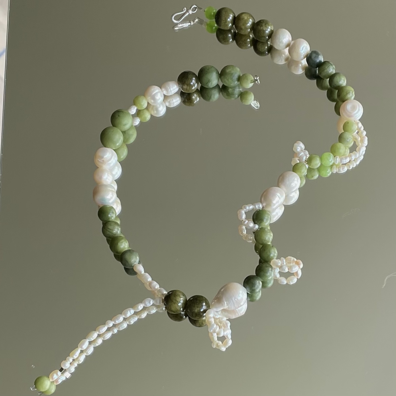 Materialer: natursten, ferskvandsperler, keshi baroque perle, lås i sterling sølv.