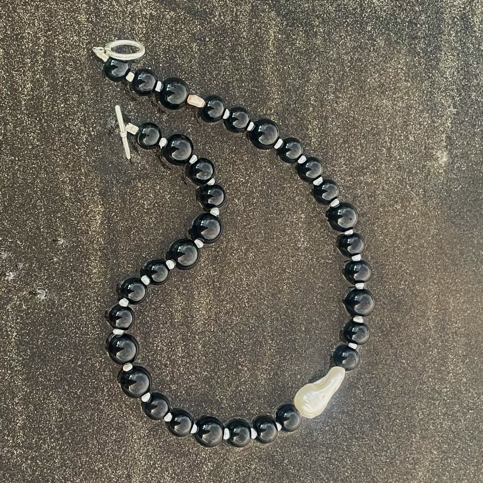 Materialer: natursten, ferskvandsperler, keshi baroque ferskvandsperle, lås i zink.